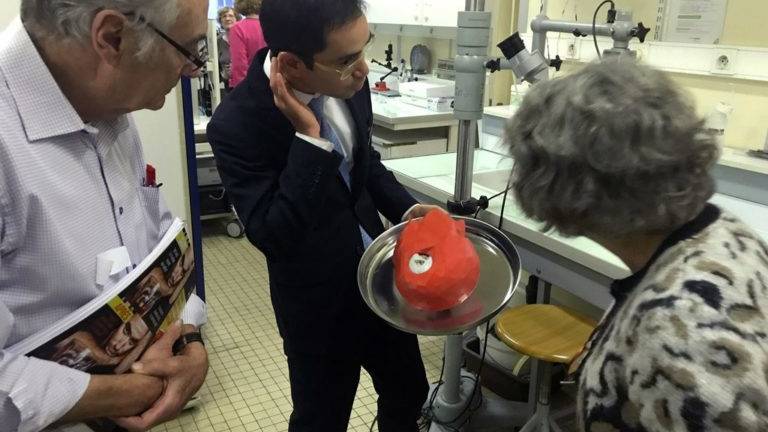 A la fin de la visite du laboratoire, une participante qui a justement un implant cochléaire est émue et dit à nos hôtes « C’est fantastique de voir cela ! C’est très touchant de voir comment vous travaillez pour nous soigner et on n’imagine pas tout ce travail en coulisses ».
