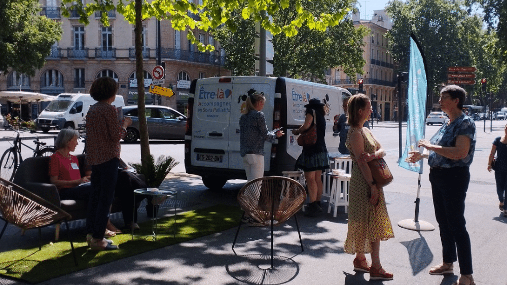 Si vous habitez Toulouse, il se pourrait que vous ayez rencontré, ou que vous rencontriez bientôt, l’équipe de l’association « Être-là » et son « Pallia Truck » : un petit van mobile aux couleurs de l’association, de plus en plus connu désormais sur les places de la ville rose. Ses bénévoles, tous spécifiquement formés à l’écoute, sortent régulièrement pour quelques heures leur petit salon d’extérieur cosy pour échanger avec les passants sur un sujet que l’on a souvent tendance à reporter au lendemain… la fin de vie et les soins palliatifs.