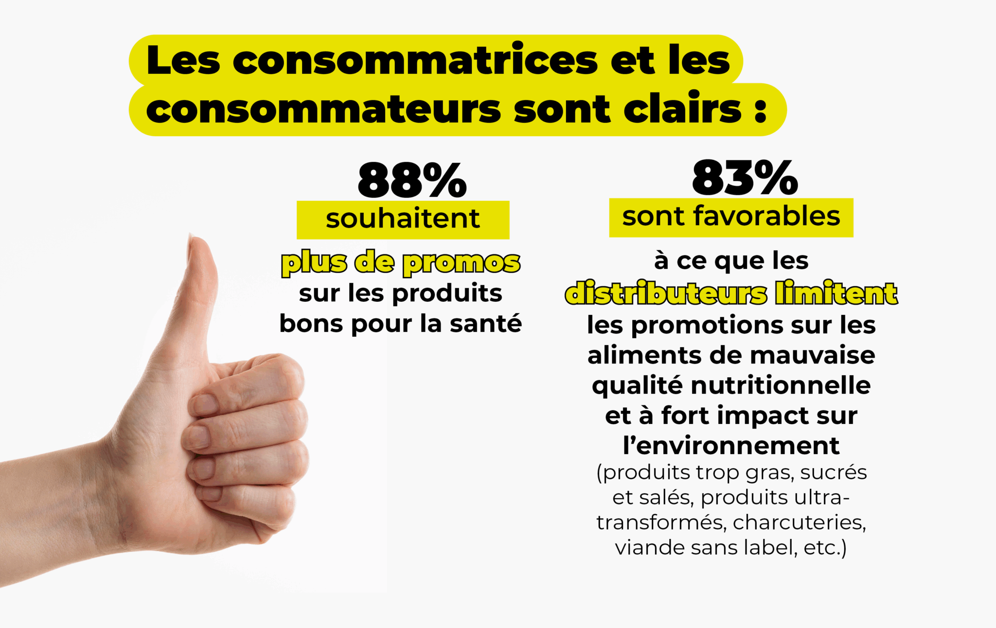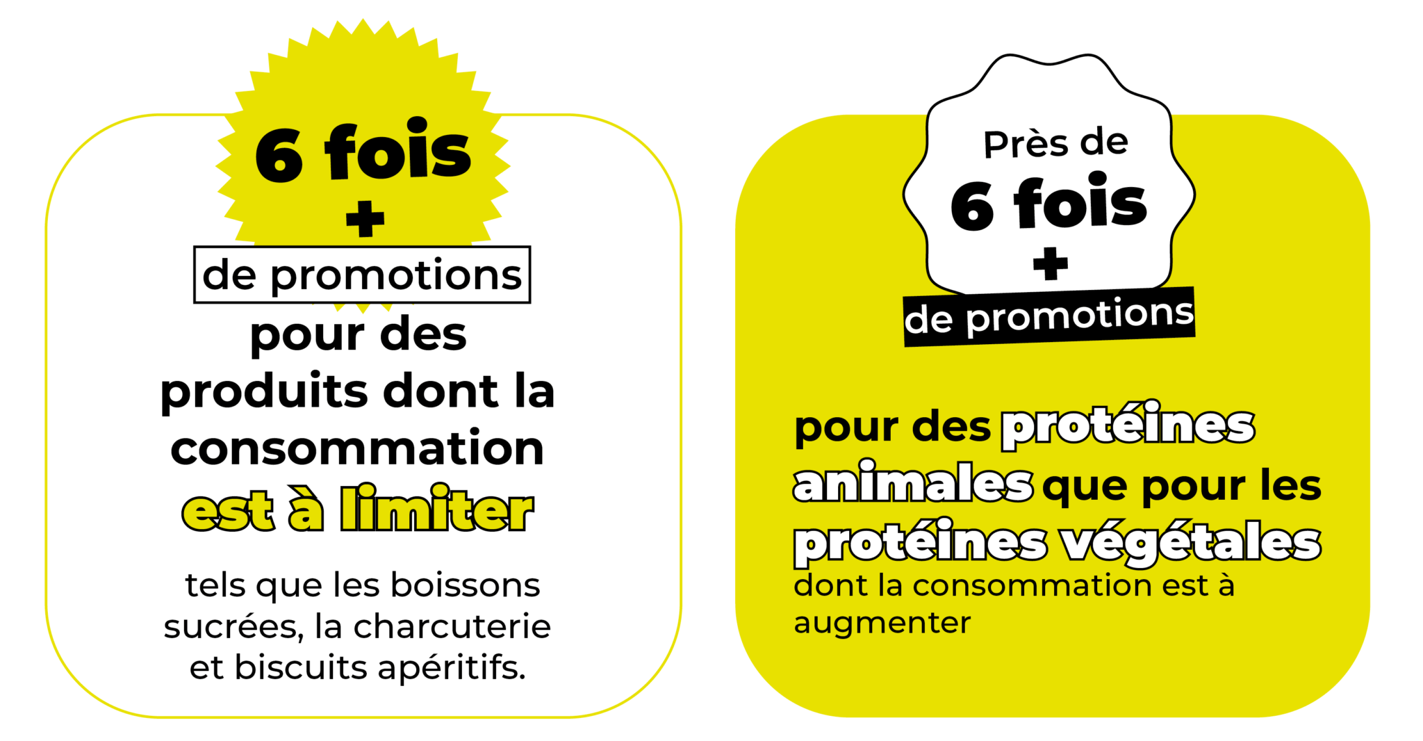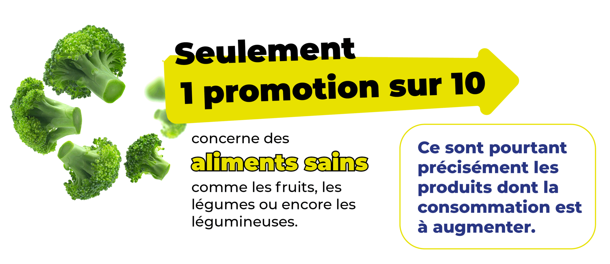 - Seules 12% des promotions portent sur des aliments sains, dont la consommation est à augmenter comme les fruits, les légumes ou les légumineuses, et que les Français ne consomment pas suffisamment ;