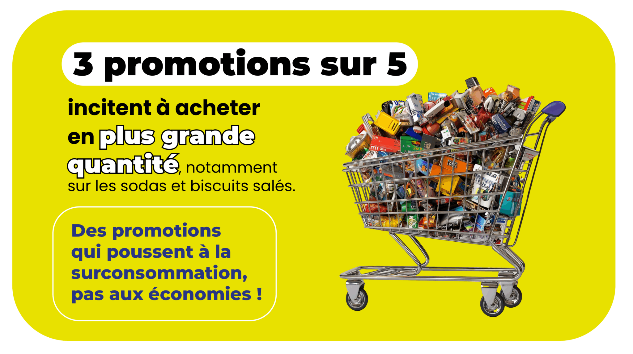 De trop nombreuses promotions incitent à surconsommer en achetant en grande quantité puisque 40% des promotions proposent d’acheter en lot ou « 2+1 offert » pour des produits à fortement limiter selon les recommandations santé.